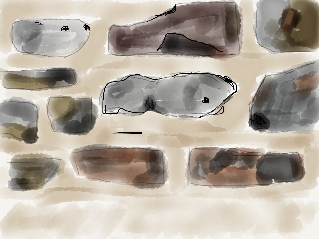 I used to paint traditional still life, and while I love anytime that I can spread paint around a canvas, I didn’t feel like I was having “fun.” When I began using bright colors, fun and funky subject matter, such as stylized flowers or personified animals, my entire outlook changed. Remember laying on the grass during the summer and seeing object in the puffy clouds. My brain has gone to the extreme on that. I see things everywhere. There is a stone wall in my tv room that I look at everyday. Sometimes the stones look like fishes, but there are two stones that are my favorites. Here is a sketch of gerbil and frog. I’m sure gonna miss them when I move!